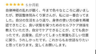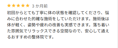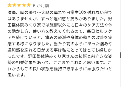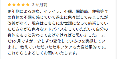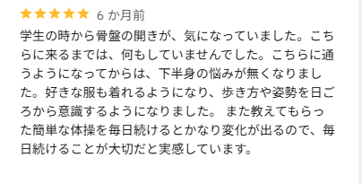 全体的にお身体の不調がスッキリされたとのこと、良かったです。続けていただくことで、良い状態をキープしていただけると思います。これからも再発しない身体を目指してケアしていきましょう!