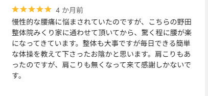 お身体の痛みが軽減されて良かったです。痛みが戻ってくることもありますが、施術を続けていただくことで、痛みのない状態を、だんだんと長い間キープできるようになっていきます。これからも痛みが再発しない身体を目指して行きましょう!