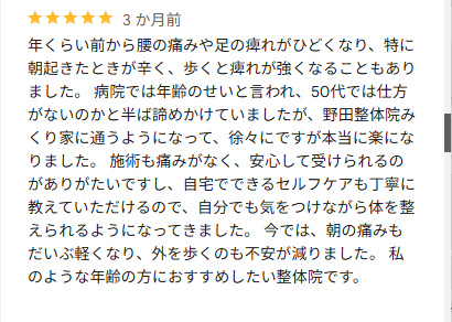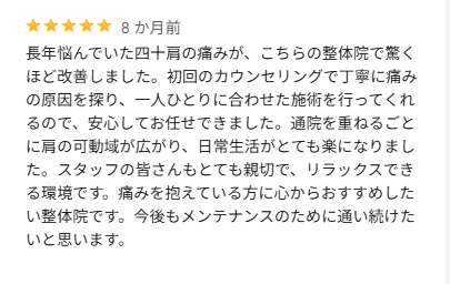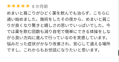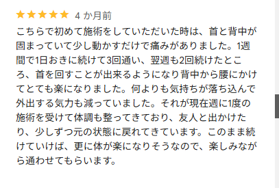 いつも(3か月位)感じていた変な痛みが、ほぼ消えた。施術後、数日したら痛みが再発したが、施術前に比べ、大分よくなっていると実感している。是非、施術を受けてみたらとお勧めします。