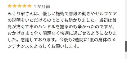 「大丈夫な気がする!」と感じていただけて良かったです。続けていただくことで、身体が楽になっていくことを実感していただけると思います。ご自宅でのケアもやってみてください。