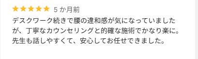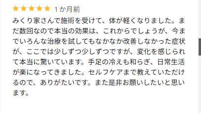2~3日後、どうなるか楽しみです。背中(腰)をやって頂いている時は、なにか…気功的なものを感じました。先生の手が温かく、その温かさやパワー?!が、体にスッと入ってくる感じがしました。施術を受ける事で、気持ち的に「今回、大丈夫そうな気がするー!!」と前向きな気持ちになります!!皆様おためしあれ♡
